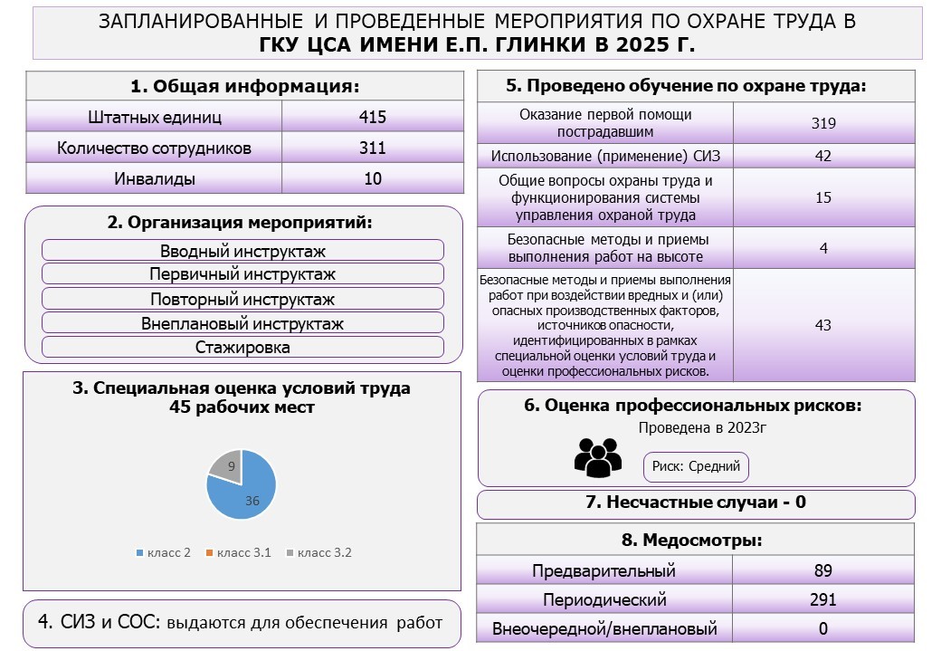 Руководство ГКУ ЦСА имени Е. П. Глинки уделяет особое внимание соблюдению требований законодательства в области охраны труда. Главной задачей является сохранение жизни и здоровья сотрудников при выполнении ими своих служебных обязанностей, создания для работников безопасных и комфортных условий для трудовой деятельности с целью предотвращения производственного травматизма и профессиональных заболеваний.