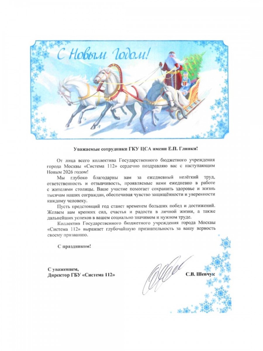 «От лица коллектива Государственного бюджетного учреждения города Москвы «Система 112» поздравляю Вас с наступающим Новым 2026 годом! Выражаю признательность за личный вклад каждого сотрудника Государственного казенного учреждения города Москвы Центр социальной адаптации для лиц без определенного места жительства и занятий имени Е.П. Глинки в помощь москвичам и гостям столицы».