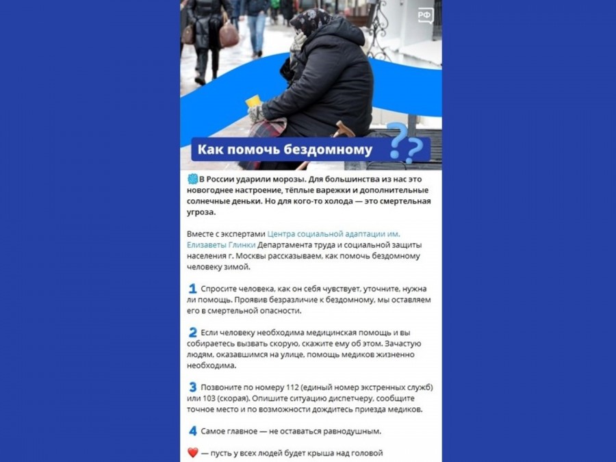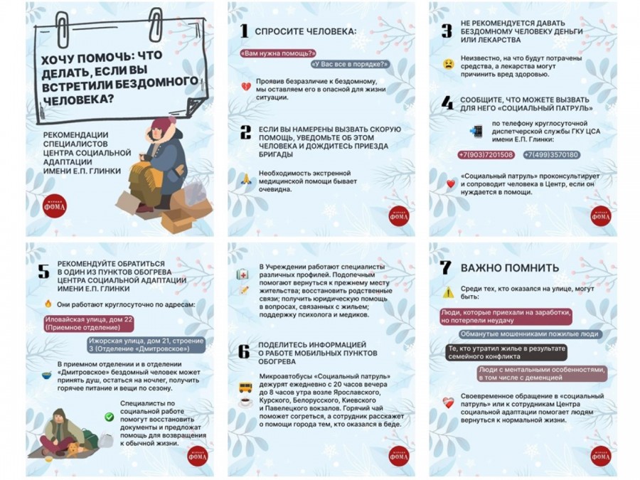 «Если вы видите человека, который лежит на земле (особенно когда на улице холодно), или если ему плохо — сразу звоните в скорую помощь.Если вы видите дезориентированного человека, который не понимает, куда идти, позвоните в диспетчерскую службу Центра социальной адаптации имени Е.П. Глинки по телефонам: +7 (903) 720‑15‑08, +7 (499) 357‑01‑80 (звонки принимаются круглосуточно)».
