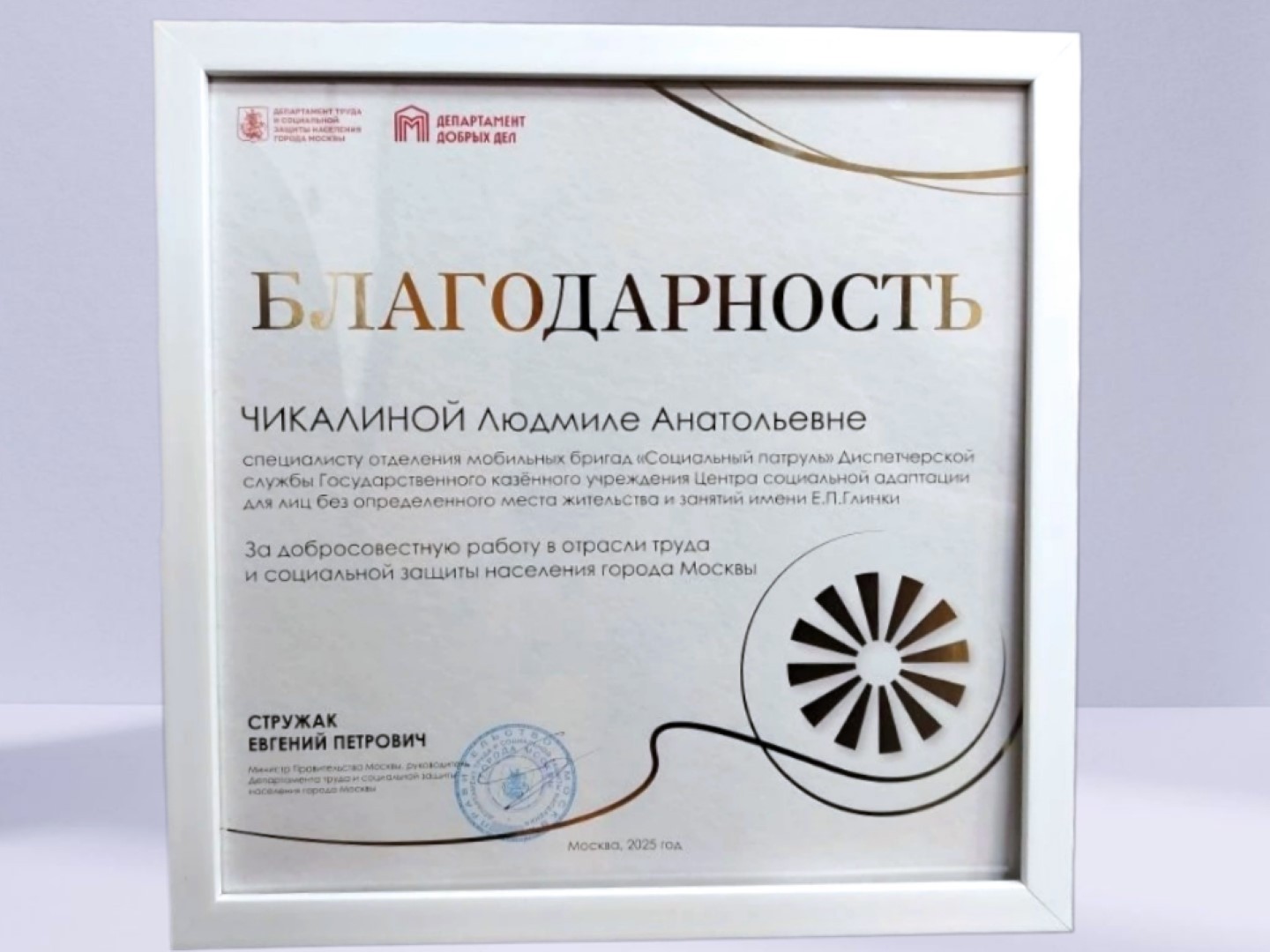 Людмила Чикалина, специалист отделения мобильных бригад «Социальный патруль», удостоена награды от Департамента труда и социальной защиты населения Москвы за добросовестную работу в отрасли.
