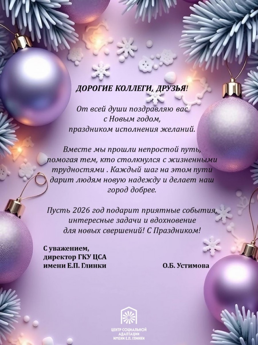 «От лица коллектива Государственного бюджетного учреждения города Москвы «Система 112» поздравляю Вас с наступающим Новым 2026 годом! Выражаю признательность за личный вклад каждого сотрудника Государственного казенного учреждения города Москвы Центр социальной адаптации для лиц без определенного места жительства и занятий имени Е.П. Глинки в помощь москвичам и гостям столицы».